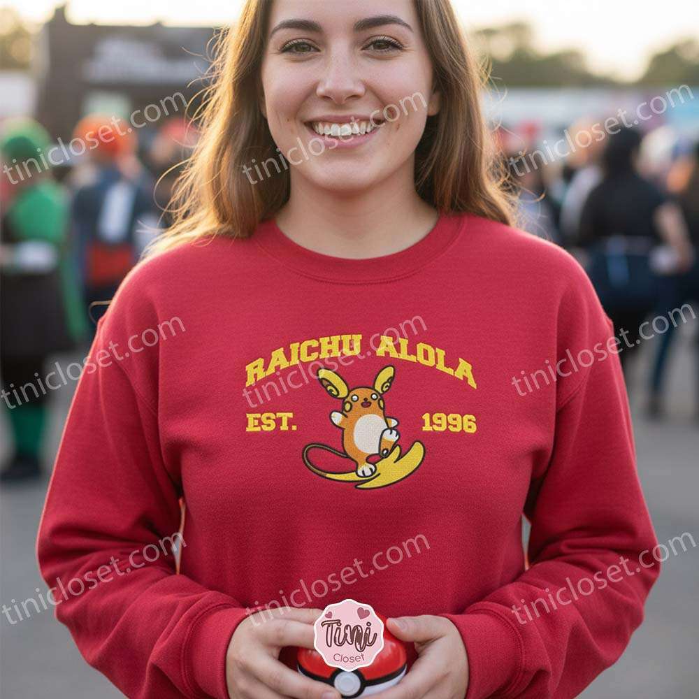 In the tropical paradise of the Alola region, the Pokemon evolution process works a little differently. Maybe it was the warm climate, or maybe—as the locals say—it was just because they ate too many sweet, fluffy pancakes. Whatever the reason, the Alolan Raichu is one of the most unique and beloved regional variants in Pokemon history. Trading its aggressive spark for a laid-back, surfing vibe, this Electric/Psychic type uses its own tail as a hoverboard. Our exclusively designed Alolan Raichu Embroidered Sweatshirt captures this chill, beach-ready energy, blending the modern lore of Generation 7 with a classic, vintage collegiate aesthetic.