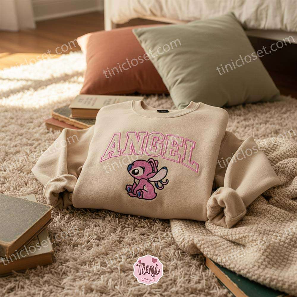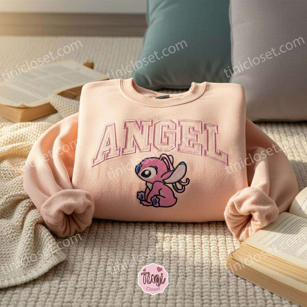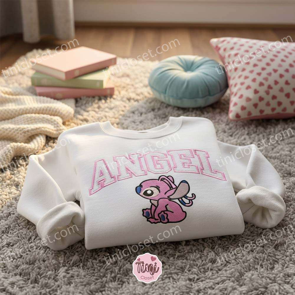 Angel Iconic Sitting Pose Embroidered Sweatshirt, Custom Classic Pink Stitchmas Hoodie, Sweet Angel Sitting Crewneck, Gift for Him Her