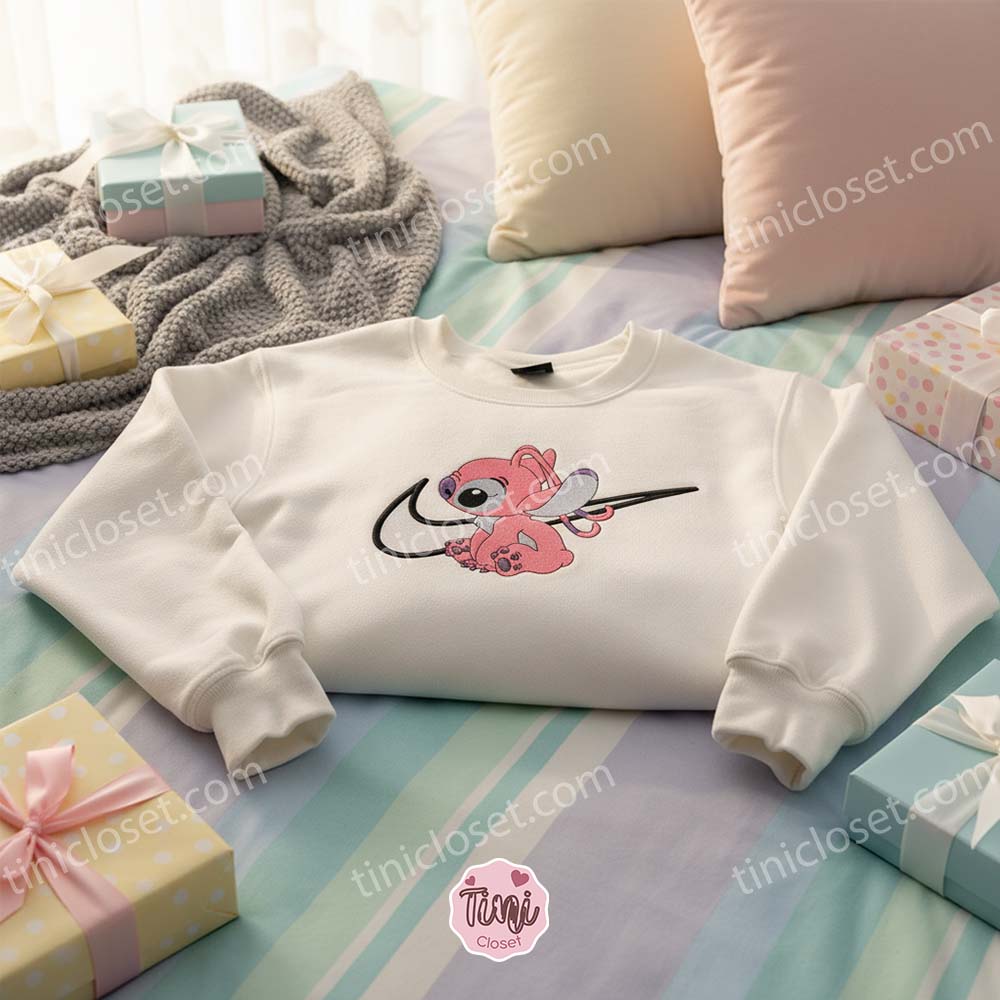 The “Angel Pink”: While Stitch is famous for his blue, this design celebrates the power of pink. The swoosh often features soft pastels, hot pinks, or lavender tones that complement Angel’s fur perfectly. It pops beautifully against a white, sand, or light pink hoodie.