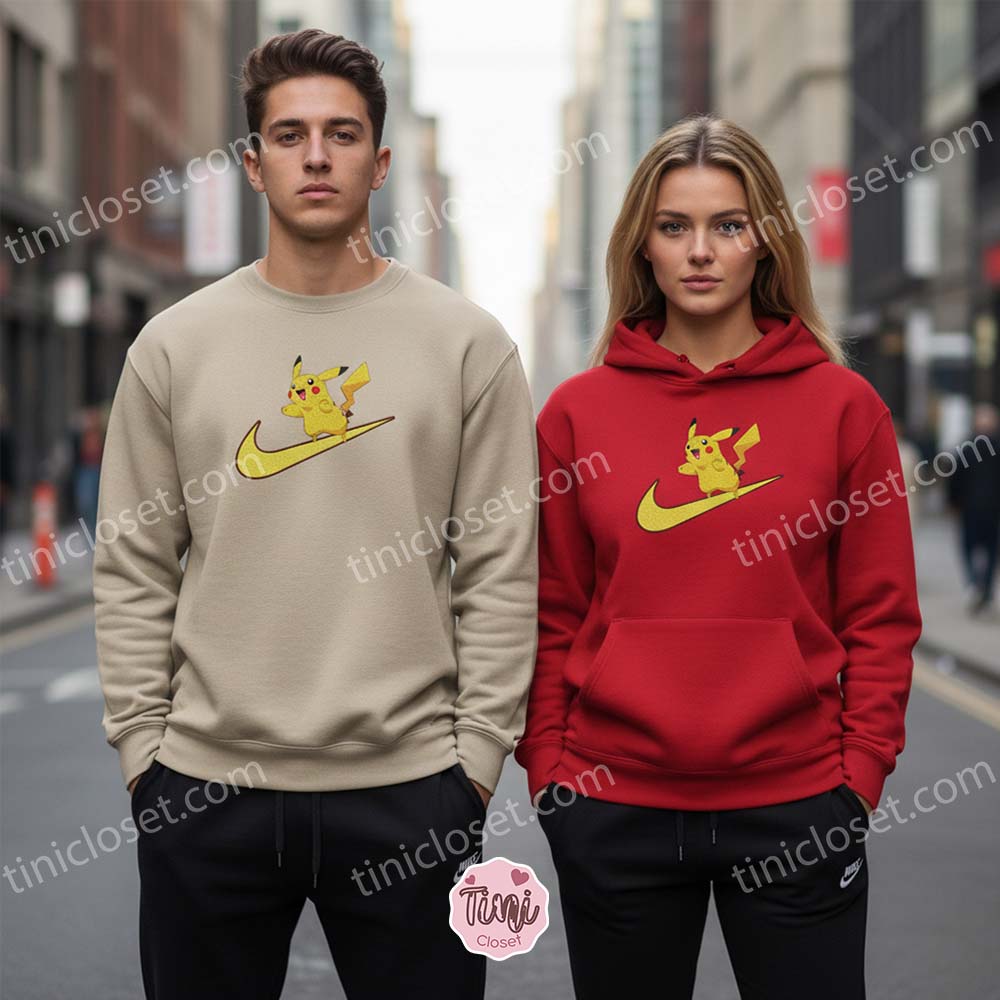 This design strikes the perfect balance between fandom and fashion. The artwork captures Pikachu in a moment of pure joy, standing on a classic “swoosh” style sporty graphic.