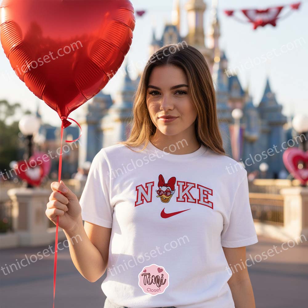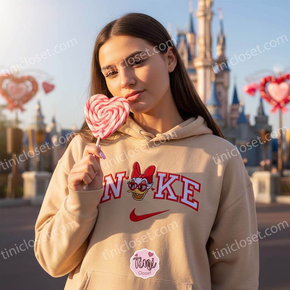 This isn’t just a piece of seasonal clothing; it is a masterclass in Custom Embroidery. Whether you are planning a romantic date at a Disney park, looking for the perfect cozy outfit for a February night, or searching for a standout addition to your Valentine Apparel collection, this Custom Nike Inspired Daisy Duck Shirt and Romantic Cartoon Embroidered Crewneck offer a level of quality and style that is simply unmatched in the USA market.