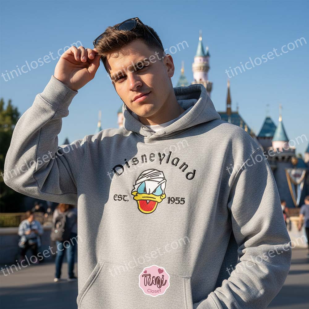 Categories: Disney Characters, All Embroidery Designs, Birthday Day Gifts, Cartoon, Holiday, Nike Inspired Logo Tags: Birthday Gift for Her, Birthday Gift for Him, custom embroidery, Donald Duck T-shirt, Est 1955 Disney Shirt, Retro Cartoon Apparel, Tinicloset, Vintage Disney Style