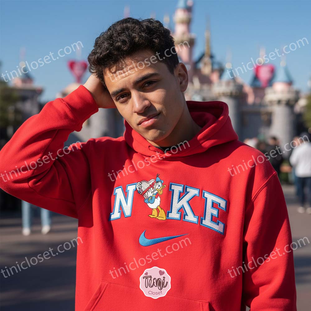 Love is an adventure, and there is no better way to embark on it than with the iconic charm of Disney’s most expressive character. At Tinicloset, we are proud to introduce the Donald Duck Valentine Embroidered Hoodie, a masterpiece designed to blend the fiery, loyal personality of Donald Duck with a touch of romantic elegance. This isn’t just another piece of seasonal clothing; it is a high-end Retro Disney Heart Shirt that redefines what it means to wear your heart on your sleeve.