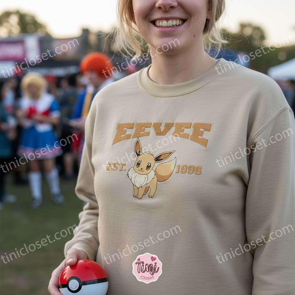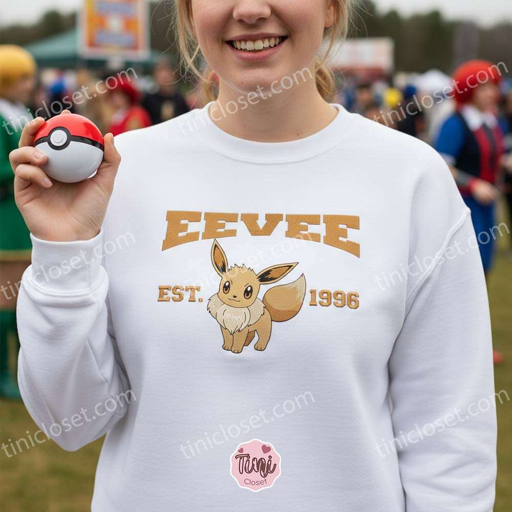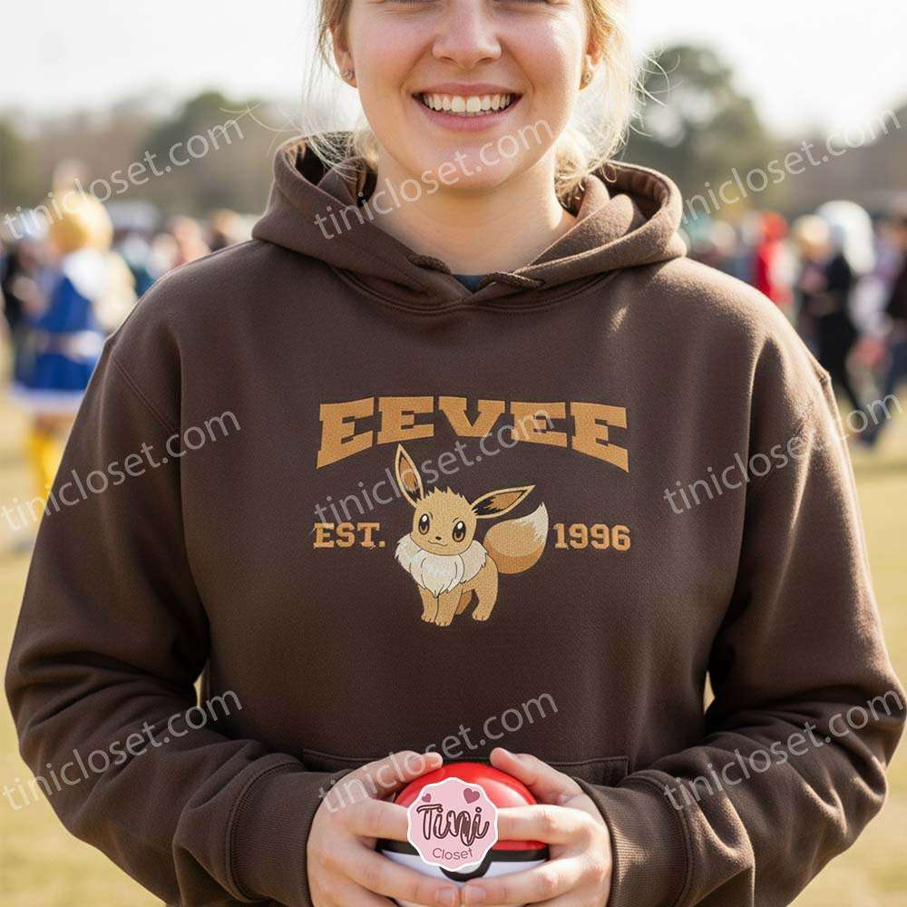 If you are looking for the ultimate tribute to everyone’s favorite Normal-type Pokémon, look no further than the Eevee Est 1996 Embroidered Sweatshirt. At Tinicloset, we understand that fandom isn’t just about watching the show or playing the game; it’s about wearing your passion. This exclusive design blends vintage collegiate aesthetics with the adorable charm of Eevee, creating a piece of apparel that stands out in any wardrobe. Whether you are a Gen 1 veteran who started your journey in the Kanto region or a new fan who just loves Eevee’s versatility, this collection is designed specifically for you.