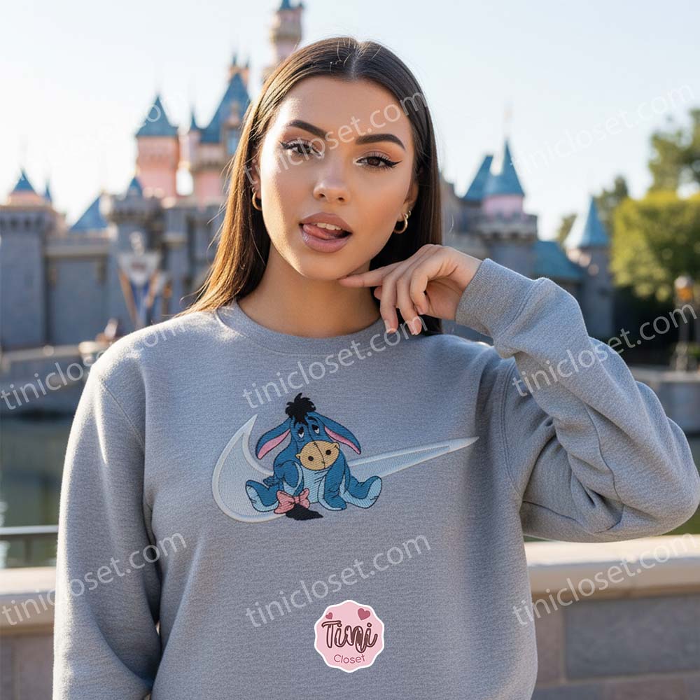 In the ever-evolving world of American fashion, the most impactful designs are those that bridge the gap between cherished childhood memories and sophisticated modern aesthetics. At Tinicloset, we are redefining this movement with the Eeyore Swoosh Hoodie. This isn’t just another piece of character merchandise; it is a meticulously crafted Disney Character Embroidered Sweatshirt designed for those who appreciate the quiet, soulful charm of Eeyore but want to wear him with a sharp, athletic, and “luxury style” edge.