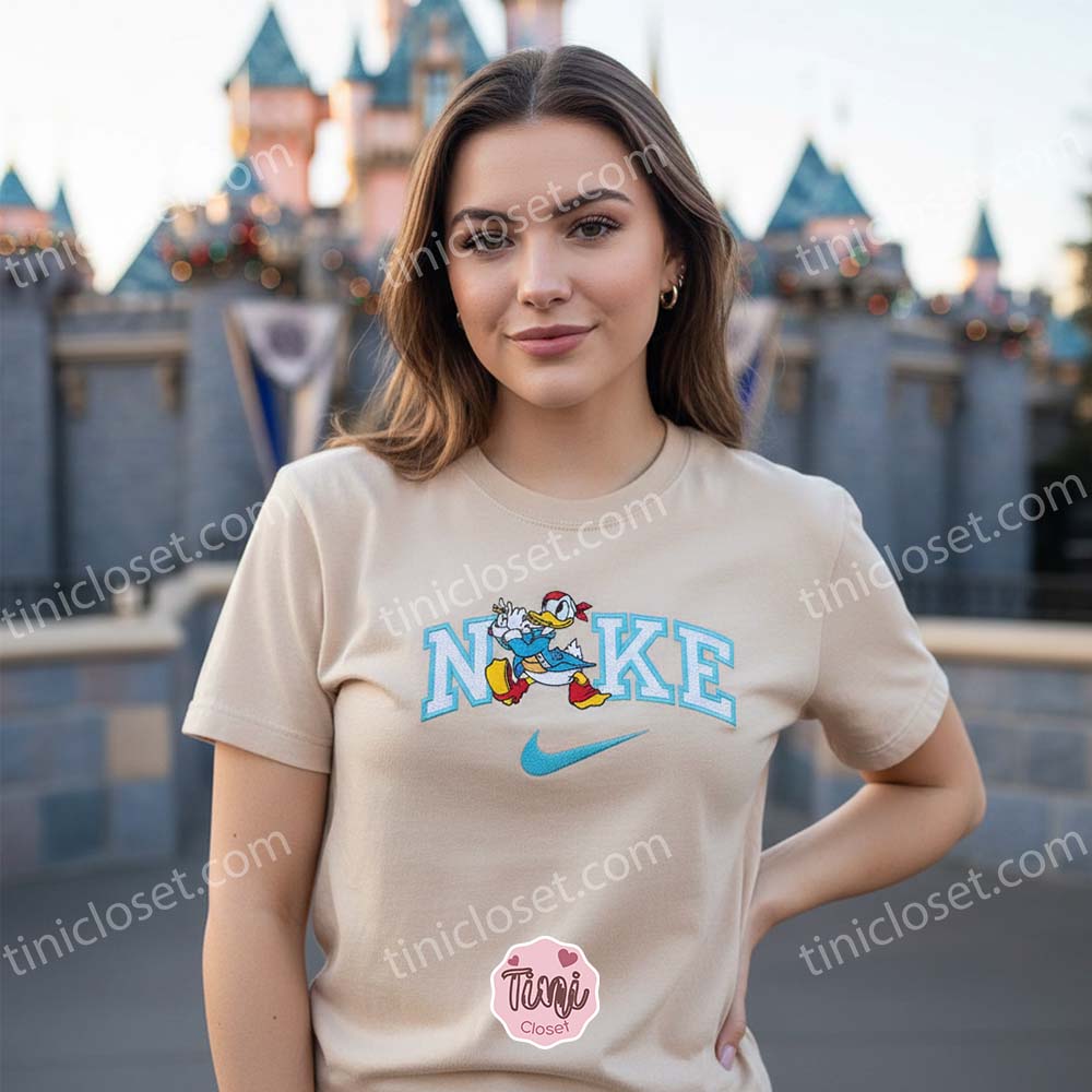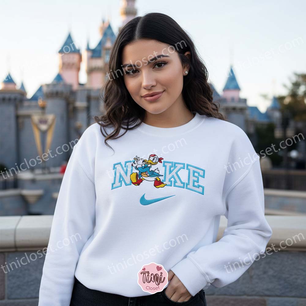 Donald Duck x Nike Cartoon Embroidered Sweatshirt, Donald Duck Embroidered Shirt, Nike Inspired Embroidered Shirt