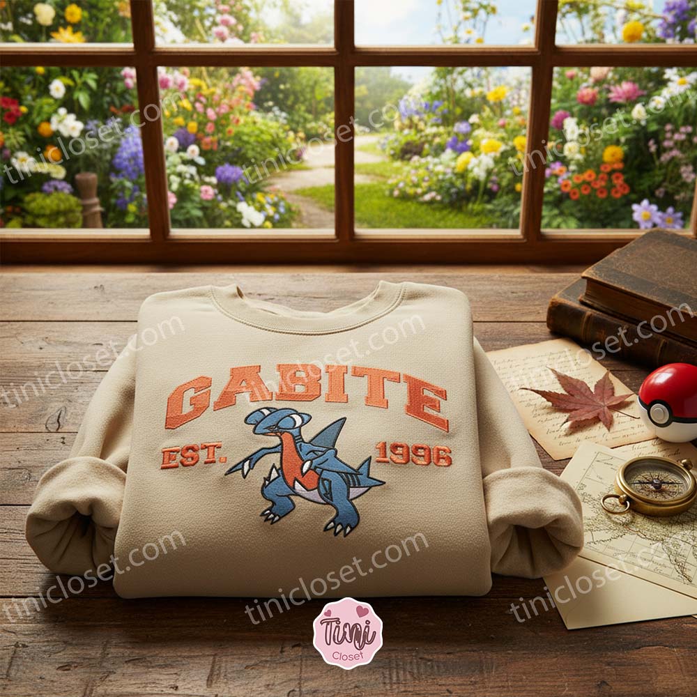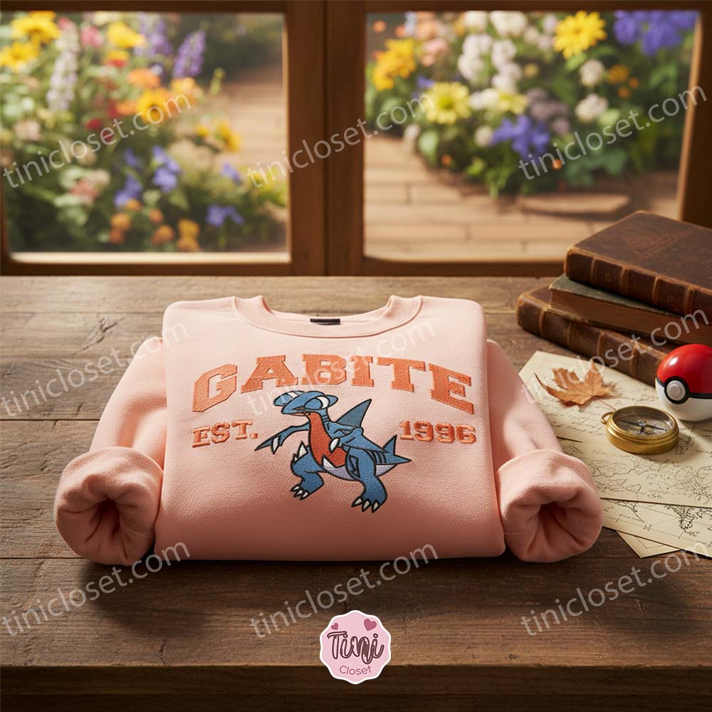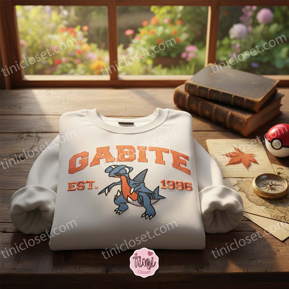 Gone are the days of cheap, peeling screen prints. We specialize in high-density, satin-stitch embroidery that brings your favorite pocket monsters to life. This Custom Pokemon Anime Pullover features the fierce “Land Shark” Pokémon, Gabite, rendered in a classic collegiate aesthetic. With “EST. 1996” stitched in bold, vintage varsity lettering, this piece bridges the gap between anime fandom and timeless academic style.