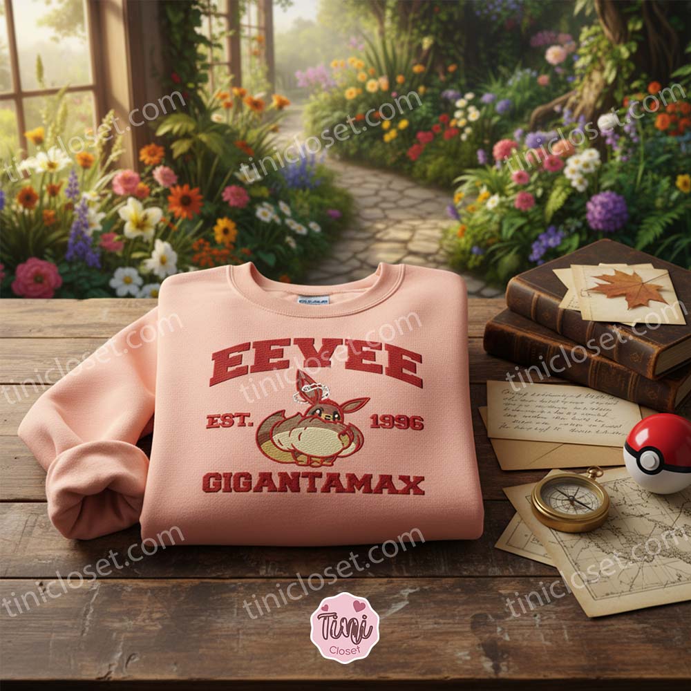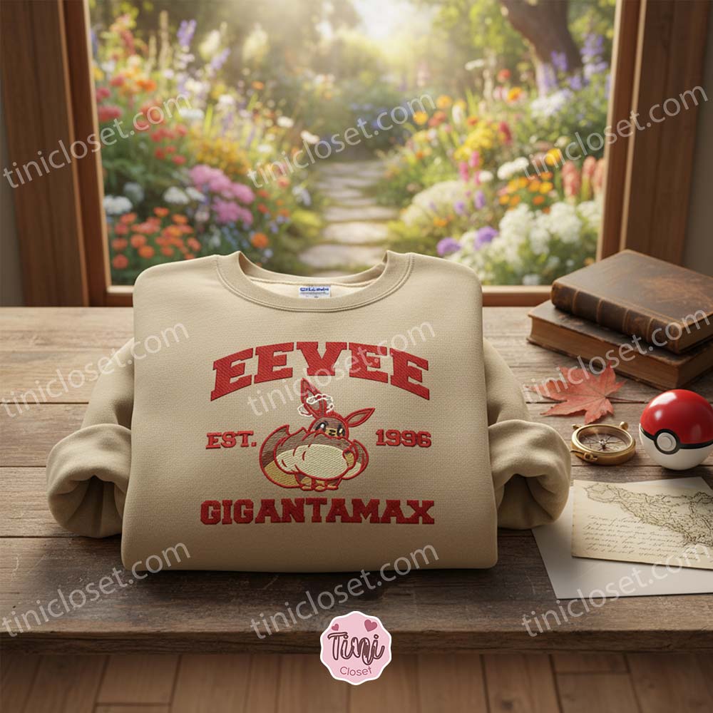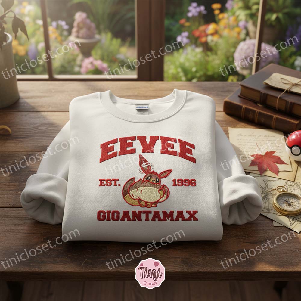 We are proud to introduce our latest addition to the shop: the Gigantamax Eevee Est. 1996 Embroidered Hoodie. This isn’t just a piece of merchandise; it is a tribute to three decades of monster-catching history, blending the classic collegiate aesthetic with the “fluffiest” version of everyone’s favorite Evolution Pokémon.
