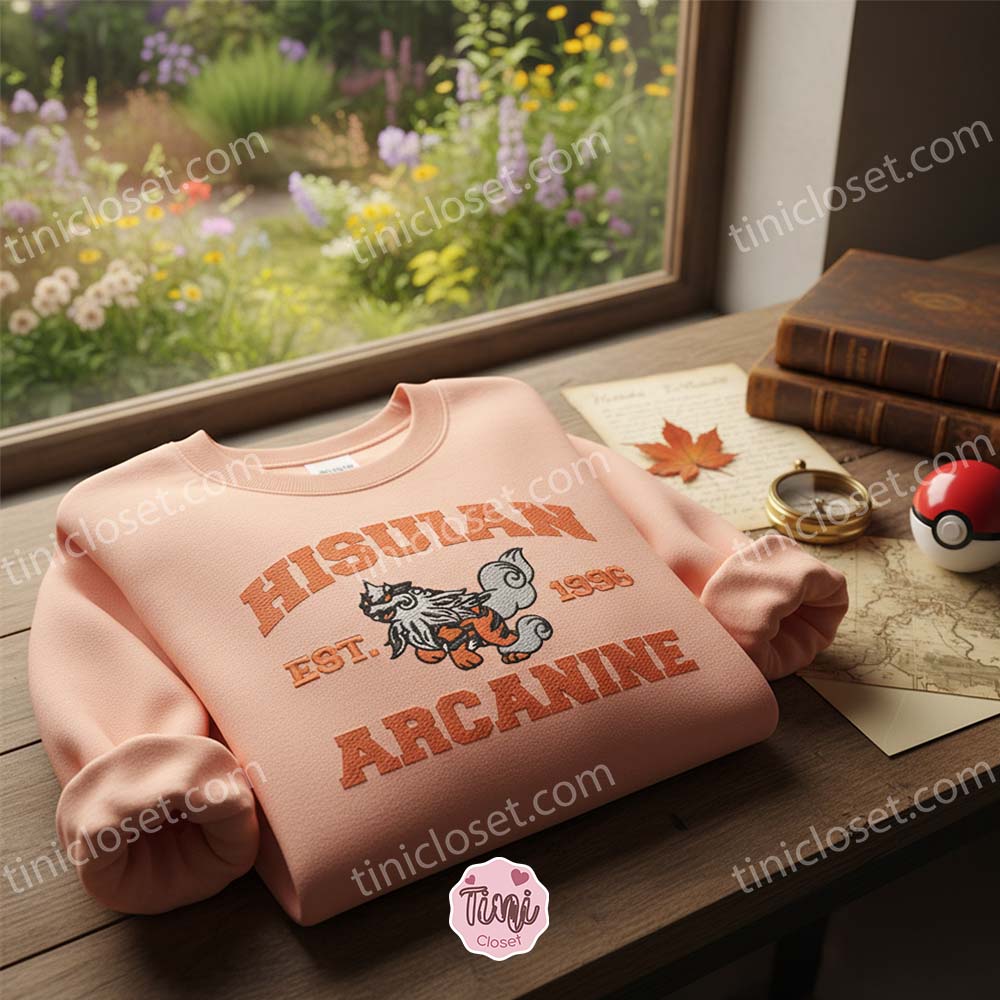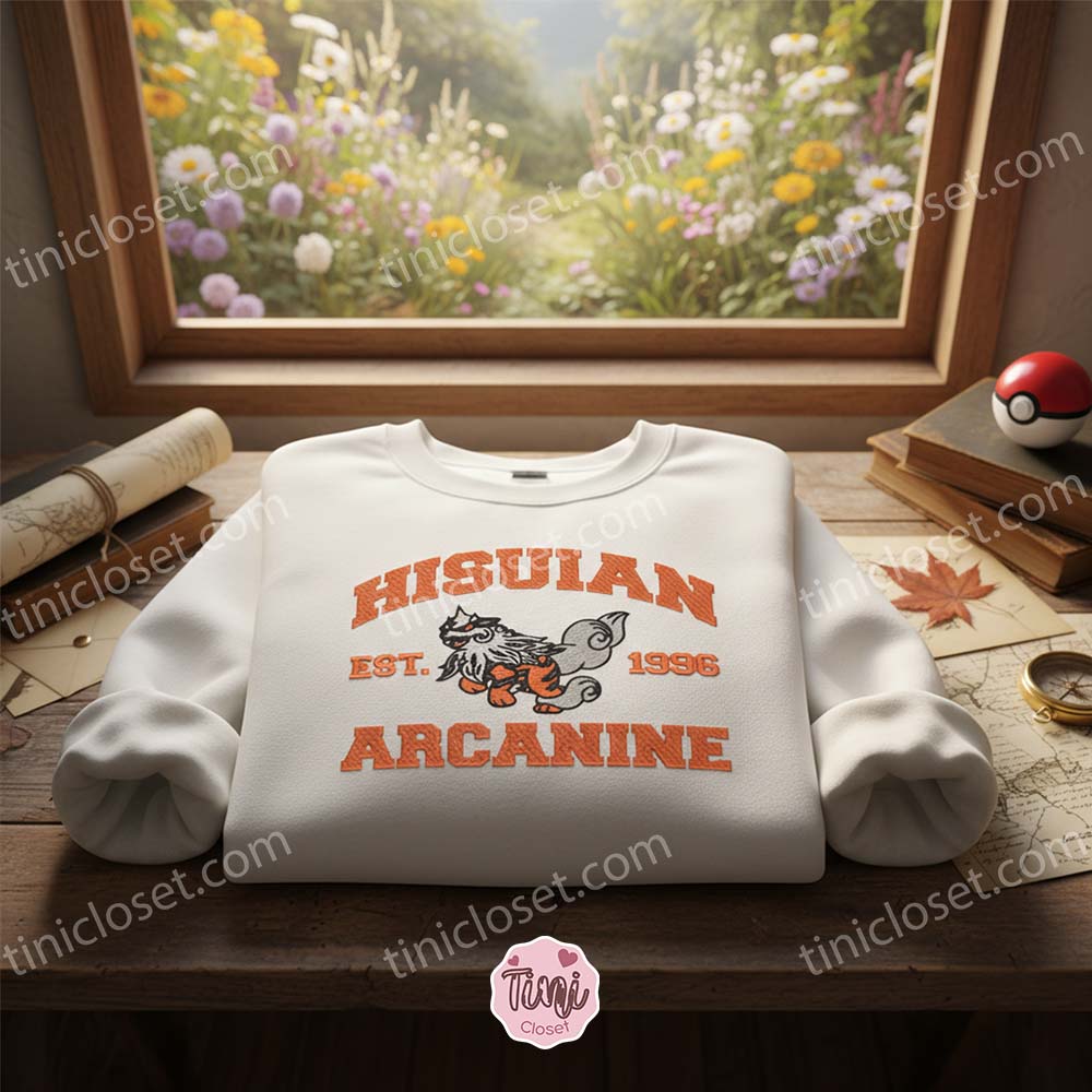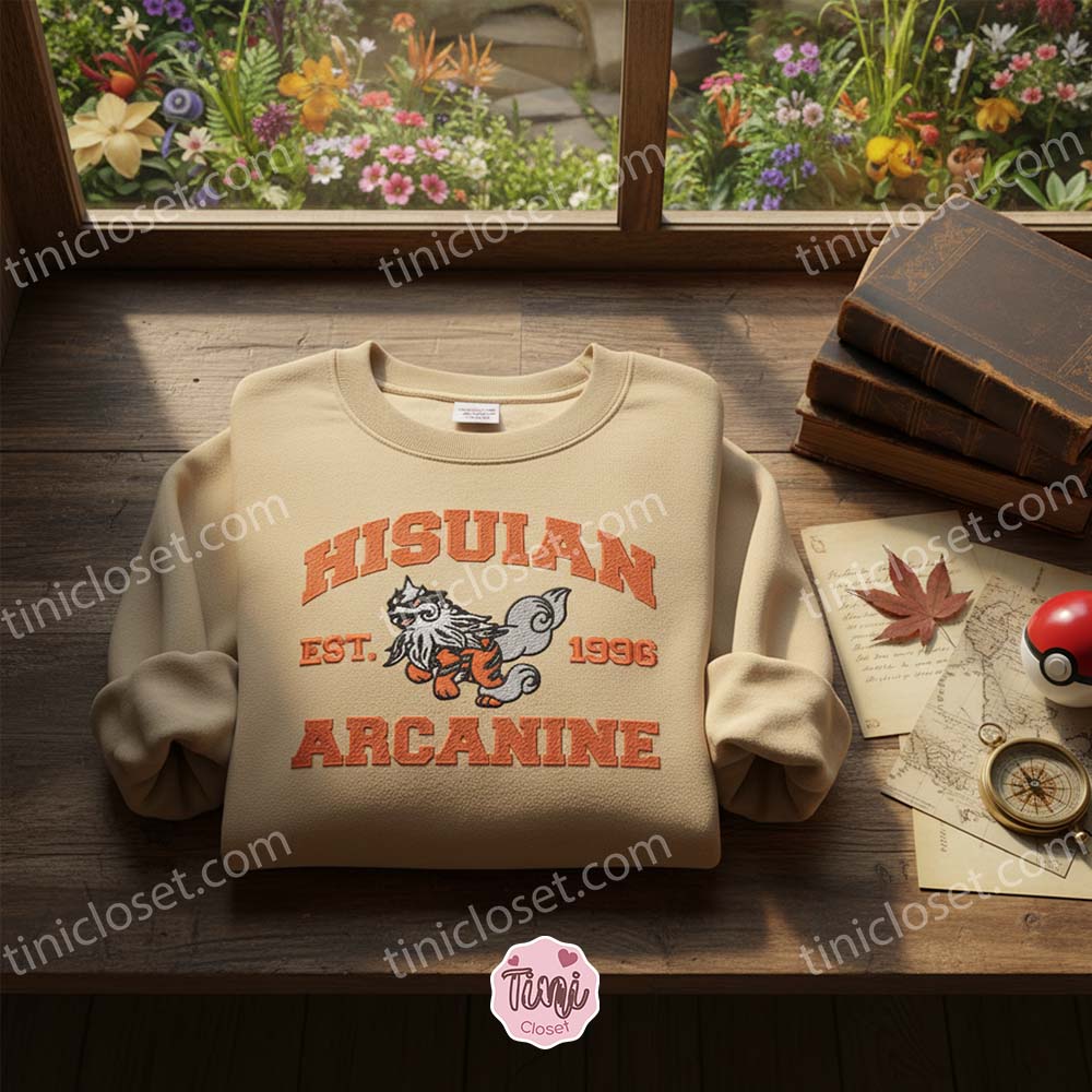 Step into the ancient region of Hisui with a modern twist. The Hisuian Arcanine Vintage Collegiate Crewneck is a seamless fusion of gaming history and timeless varsity fashion. For fans of Pokémon Legends: Arceus, the introduction of the Hisuian form gave a beloved classic—Arcanine—a darker, rock-infused edge. At Tinicloset, we have captured that majestic, stony elegance and reimagined it through the lens of 90s American collegiate wear. This isn’t just a piece of merchandise; it is a statement piece for trainers who appreciate the deep lore of the Pokemon universe.