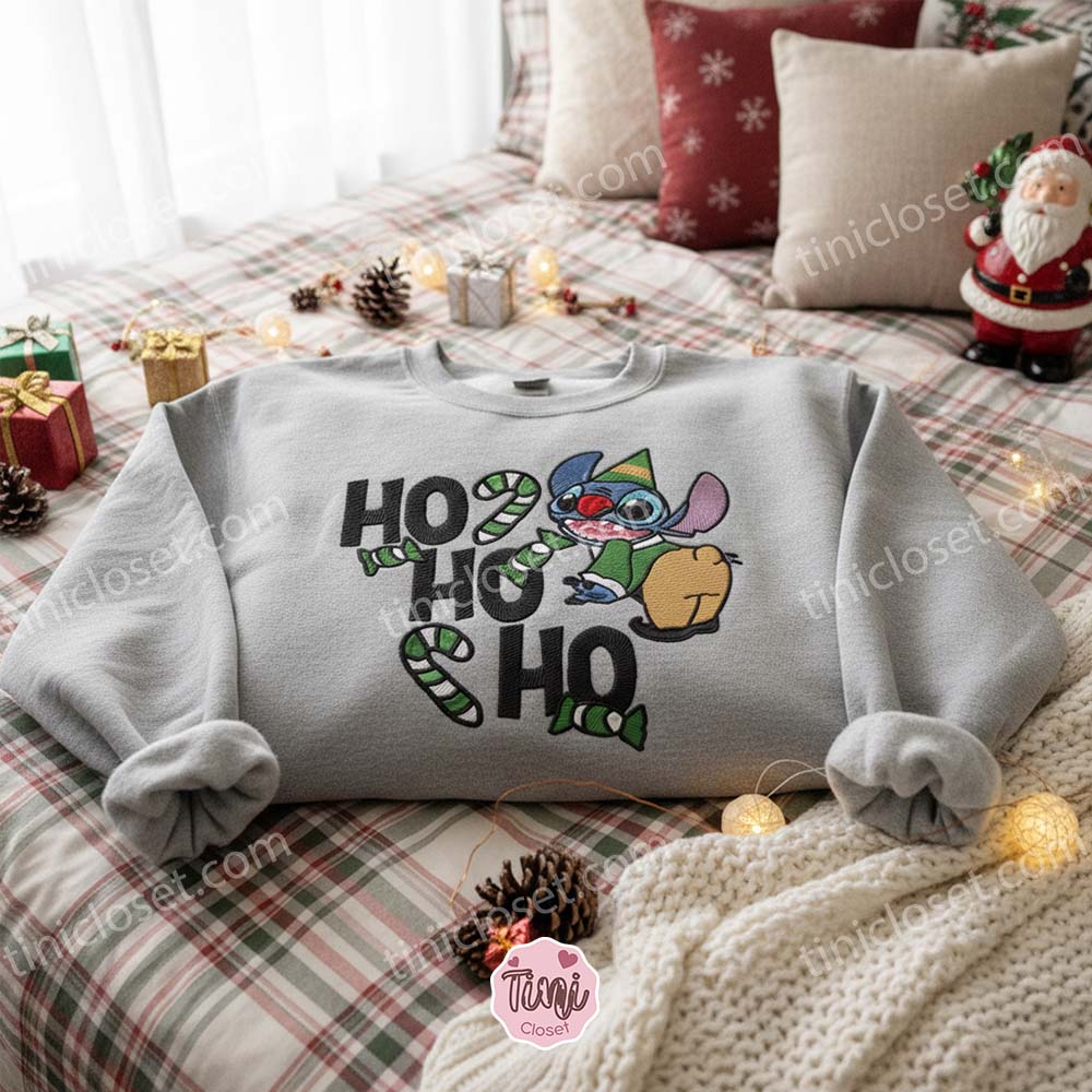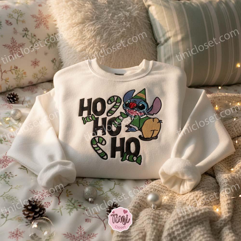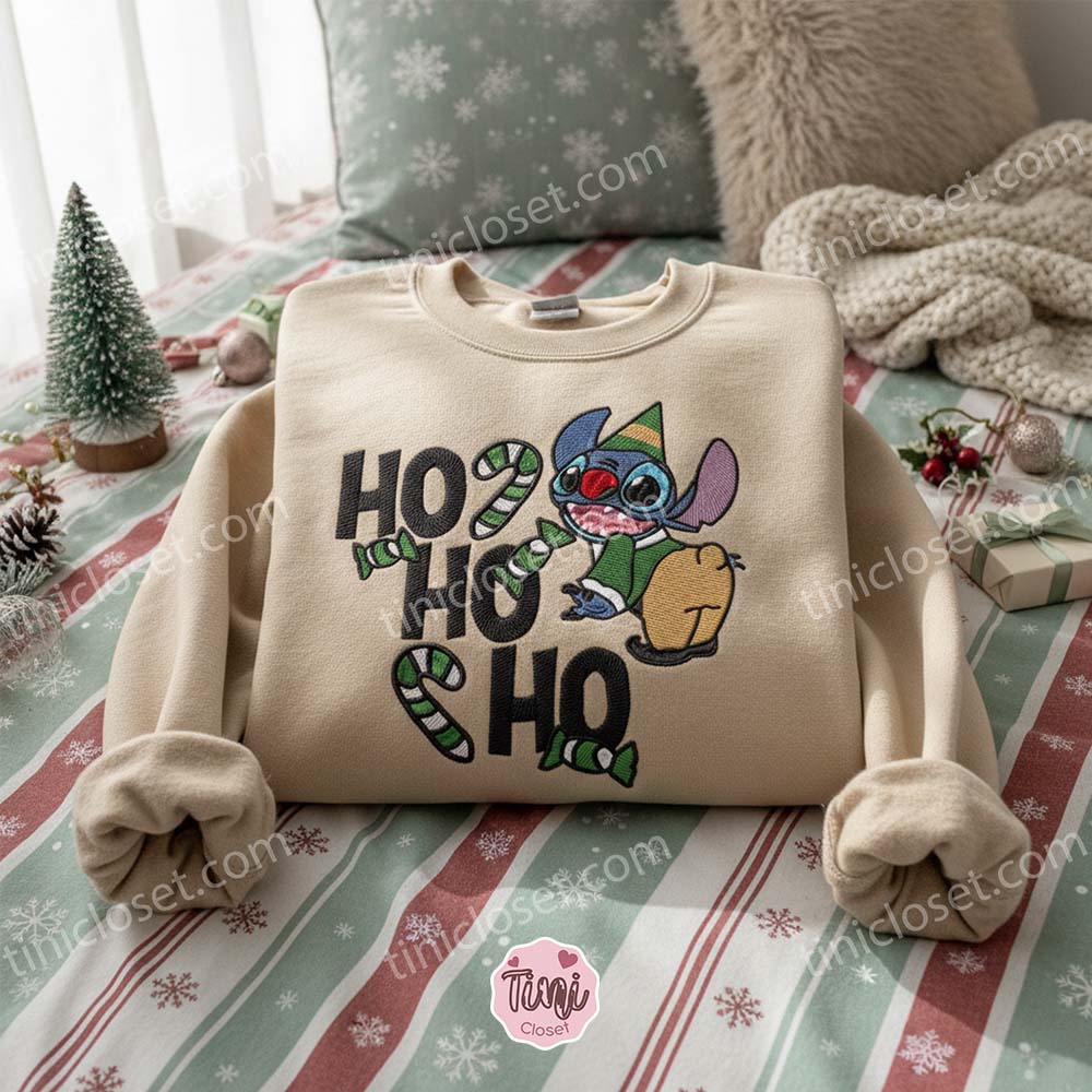 Santa has plenty of elves making toys, but he only has one Experiment 626 causing beautiful holiday chaos. This season, swap the traditional red suit for a splash of green and blue with the Jolly Stitch Elf Ho Ho Ho Embroidered Sweatshirt. We have reimagined everyone’s favorite alien as the hardest-working (and hungriest) elf in the workshop, complete with a festive green outfit and a giant candy cane.