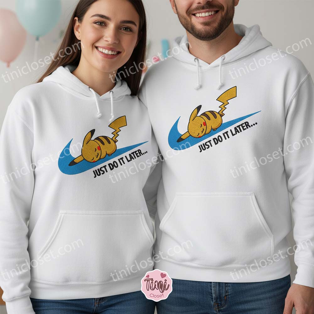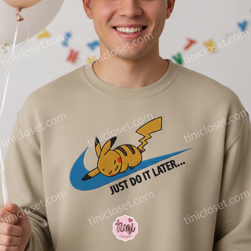 Let’s be honest: even the very best Pokémon Masters need a day off. If your spirit animal is less “Gym Leader” and more “Snorlax,” we have the perfect fit for you. Introducing the “Just Do It Later” Pikachu Embroidered Sweatshirt from Tinicloset. This hilarious parody design combines the sleek look of classic athletic wear with the undeniable cuteness of a sleepy Pikachu, creating a hoodie that says, “I could go for a run, but I’d rather take a nap.”