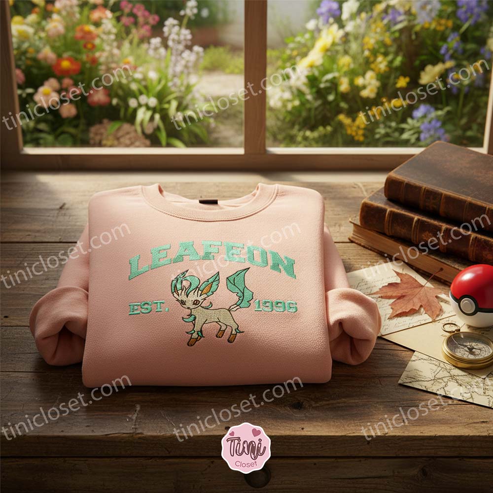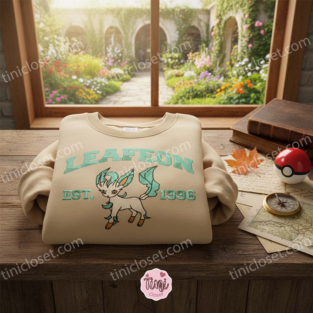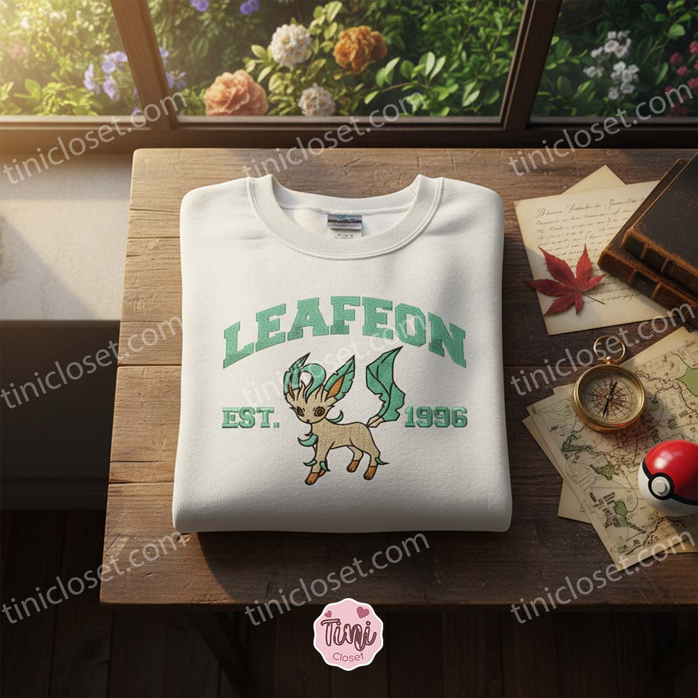 The sweatshirt features a crisp white/cream base that serves as a canvas for the stunning embroidery. The text “LEAFEON” and “EST. 1996” are stitched in a vintage varsity font using a beautiful shade of sage green. This specific shade isn’t just a nod to Leafeon’s Grass-typing; it’s a direct hit on the current earth-tone fashion trends. The central artwork features Leafeon in a playful, poised stance, its leaf-like tail and ears rendered in exquisite detail. It’s a subtle, sophisticated way to show off your fandom.