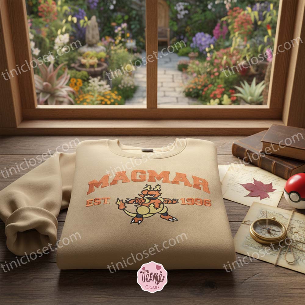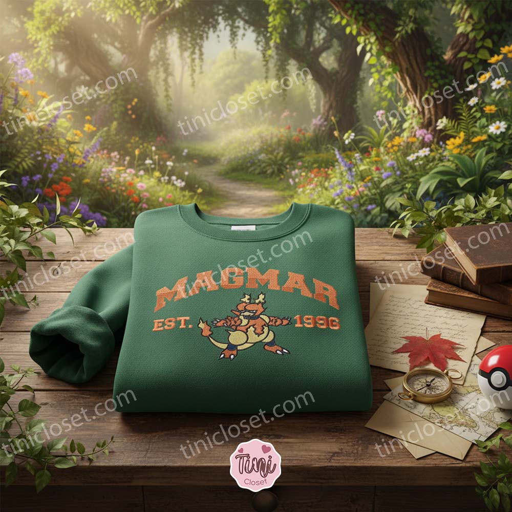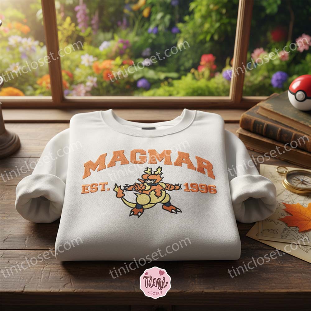 In the original lineup of 151 Pokemon, few creatures captured the imagination quite like Magmar. With its fiery breath, distinctive design, and reputation as the “Spitfire Pokemon,” it became an instant icon of the Kanto region. Now, you can wear that fiery legacy with our exclusive Magmar Est 1996 Embroidered Pullover.