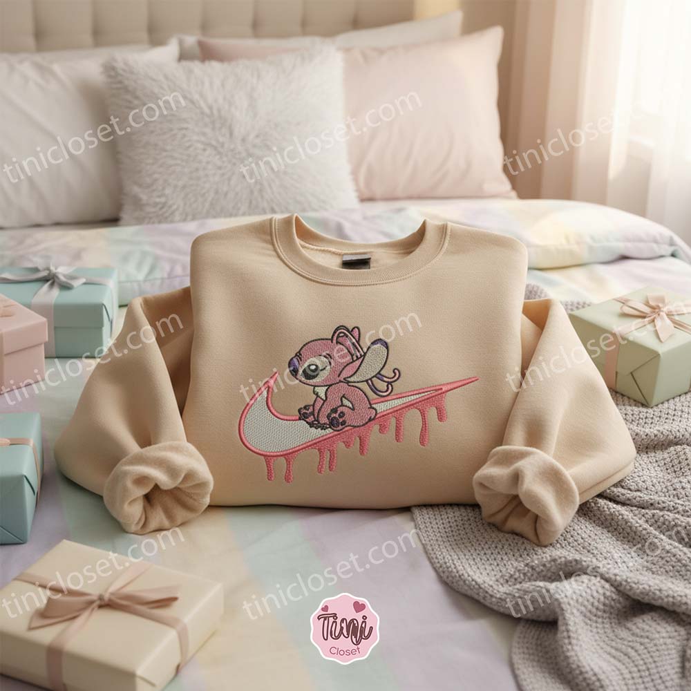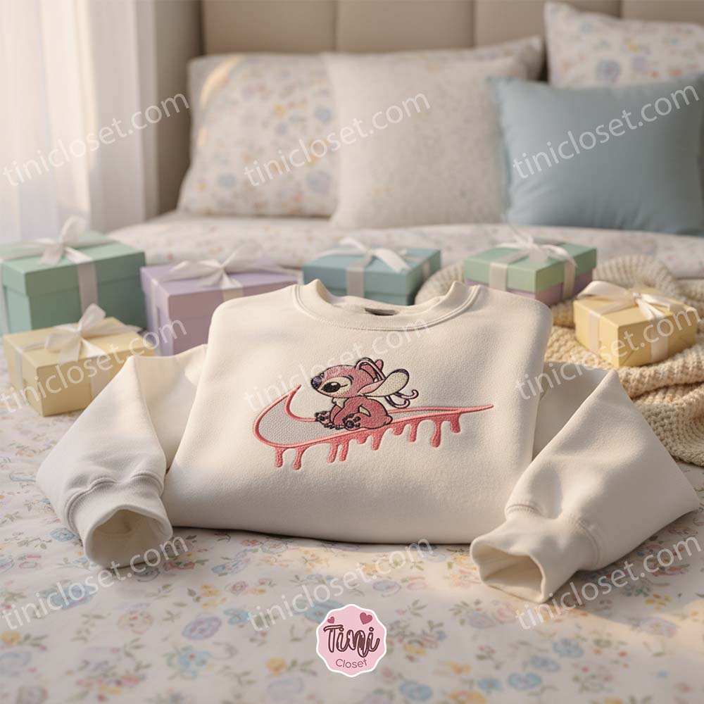 The Angel Aesthetic: While the Stitch version brings the cool blues, this design is all about “Angel Energy.” It features the adorable pink experiment interacting with the swoosh—maybe she’s sitting on it, singing to it, or blowing a kiss across the chest. It’s sweet, sassy, and unmistakably cute.