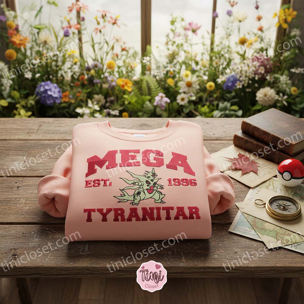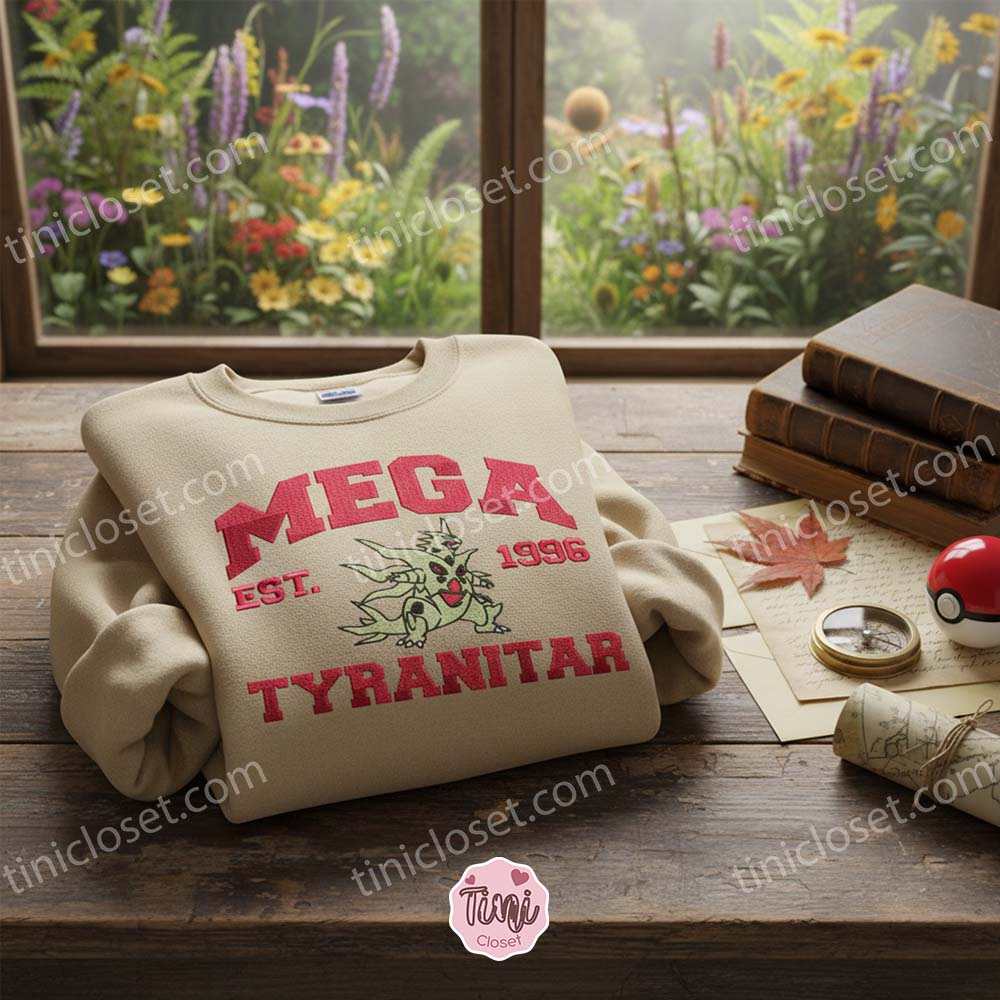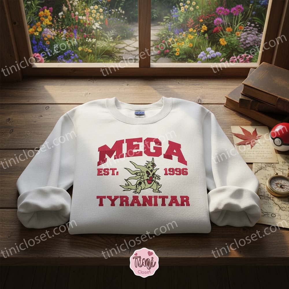 Welcome to Tinicloset, where nostalgia meets premium craftsmanship. If you are looking to dominate the fashion game with the same ferocity as a Pseudo-Legendary, you have arrived at the right place. Our Mega Tyranitar Embroidered Sweatshirt is not just a piece of clothing; it is a tribute to one of the most fearsome and beloved creatures in the Pokémon universe. Designed for the dedicated trainer and the modern anime enthusiast, this collection captures the raw energy of Mega Tyranitar in stunning, thread-by-thread detail.