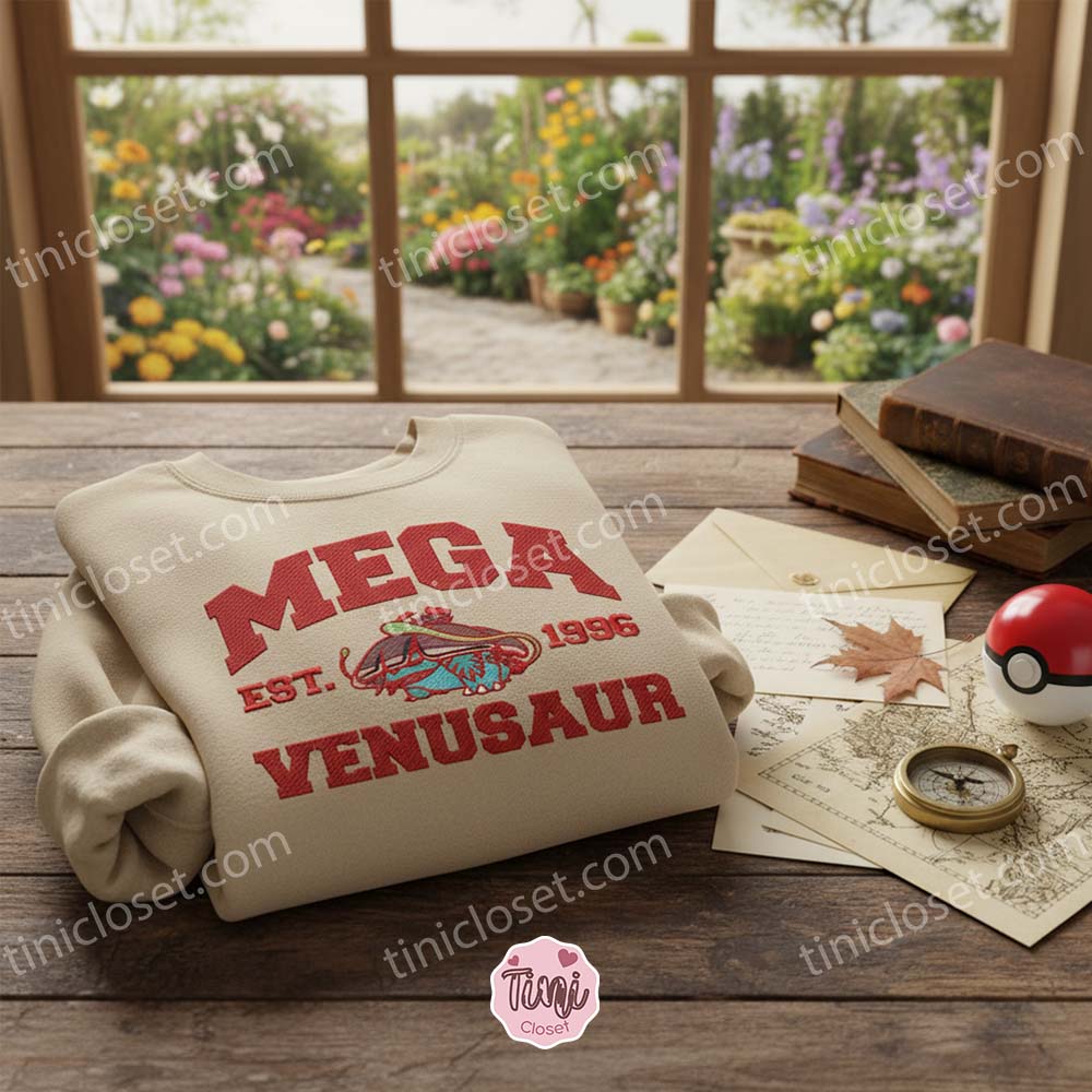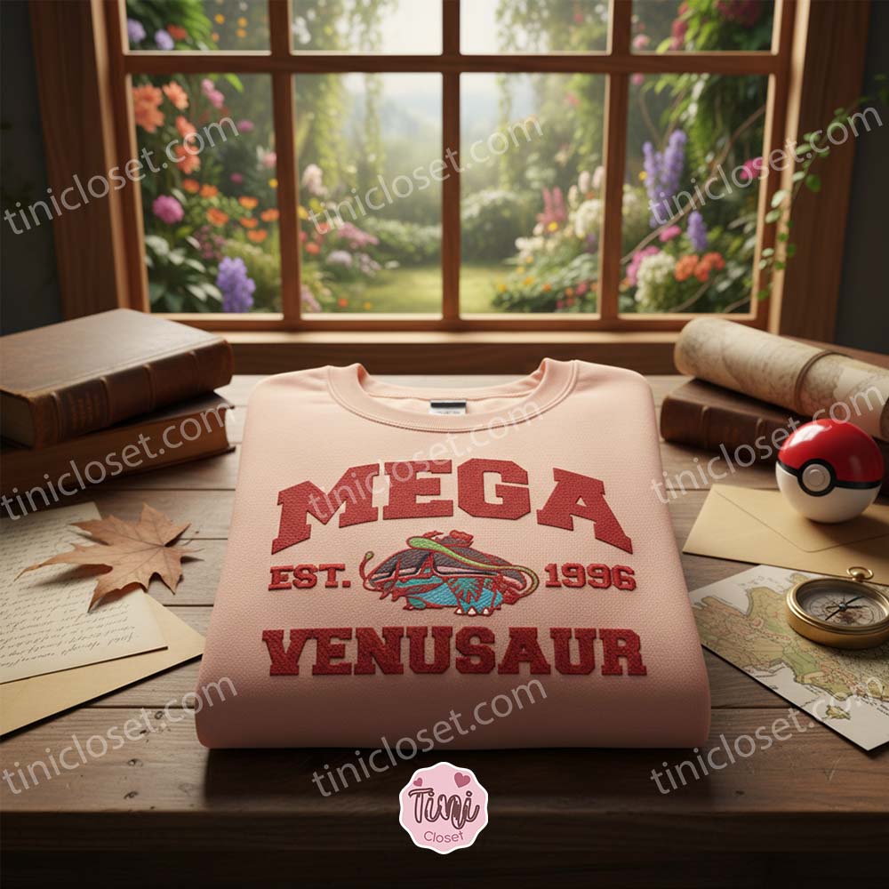 A Design That Evolves With You This isn’t just another screen-printed top that will peel after a few cycles in the dryer. At Tinicloset, we specialize in high-density embroidery. The design features the powerhouse Mega Venusaur in its full glory, stitched with vibrant teal, green, and pink threads that pop against the neutral sand-colored fabric. The artwork is framed by bold, varsity-style red lettering spelling “MEGA VENUSAUR” and “EST. 1996″—a direct nod to the year the pocket monster phenomenon launched on the Game Boy. This vintage aesthetic allows fans to wear their passion discreetly and stylishly, blending seamlessly with everyday fashion trends in the US.
