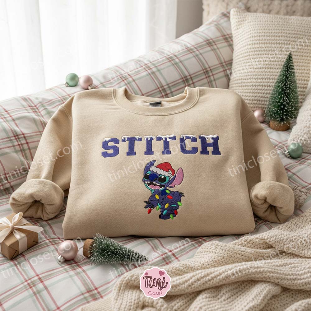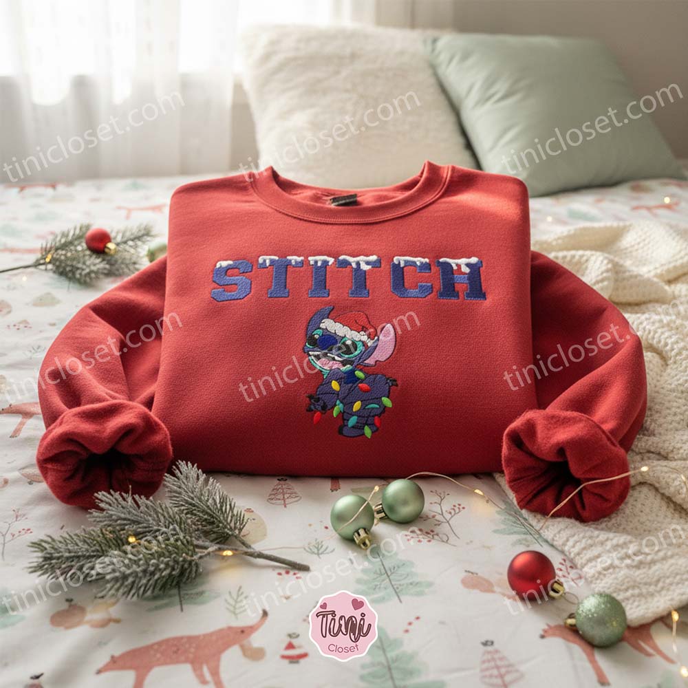 The Ultimate Festive Mashup: This design has it all. You get Stitch wearing a floppy Santa hat, often tangled in or holding vibrant Christmas lights, accompanied by the cheerful “Merry Stitchmas” text. It’s a complete holiday scene embroidered right onto your chest.