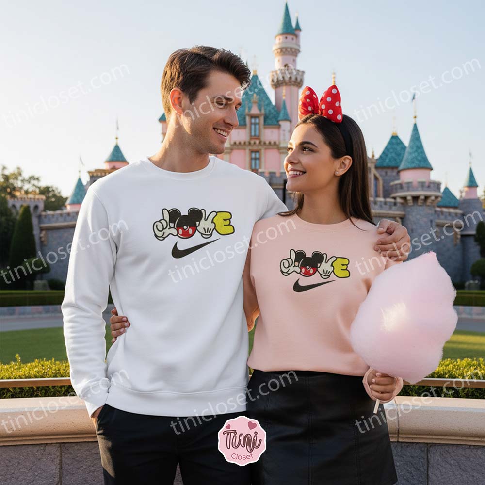 Mickey Mouse Love Sign Sporty Embroidered Shirt, Disney Inspired Swoosh Love Tee, Cute Mickey Valentine Sweatshirt