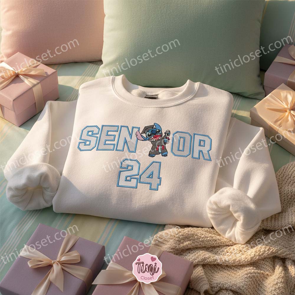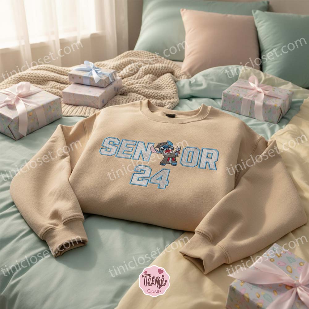 If you are looking for a Custom Any Year Senior Sweatshirt (yes, we can do 2024, 2025, 2026, and beyond!), this is your perfect match. We have taken the galaxy’s most mischievous alien, dressed him in a cap and gown, and added your specific graduation year. It is a unique Experiment 626 Ohana Crewneck that captures the nostalgia of childhood and the excitement of the future.