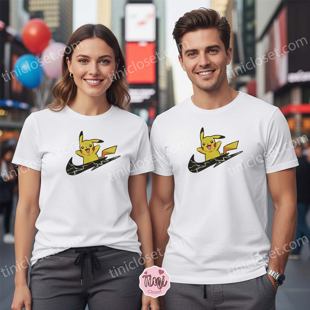 Unlike cheap screen-printed graphics that crack and fade after a few washes, our collection focuses on high-quality, dense embroidery. The star of this design is, of course, Pikachu. Captured in a dynamic pose, Pikachu is stitched with vibrant yellow threads, riding the “swoosh” with his signature lightning bolt tail sparking with energy.