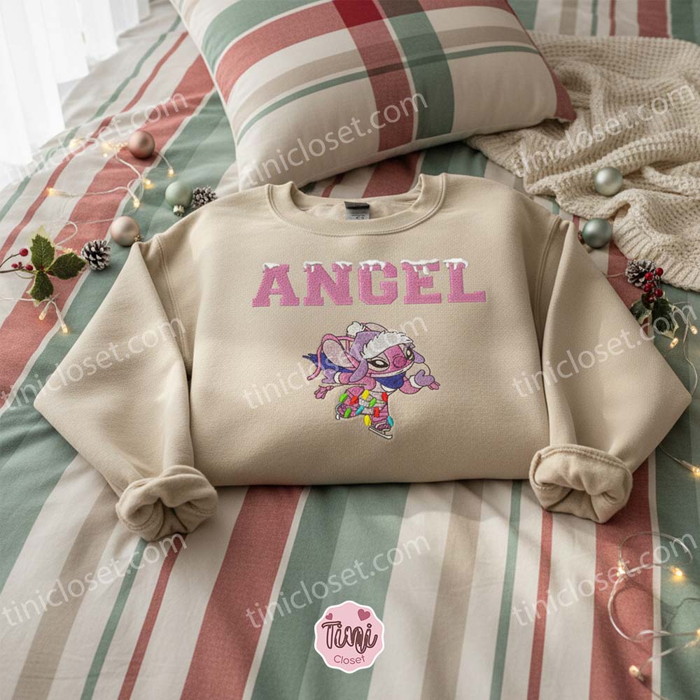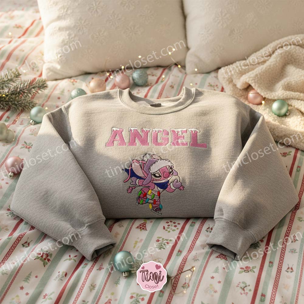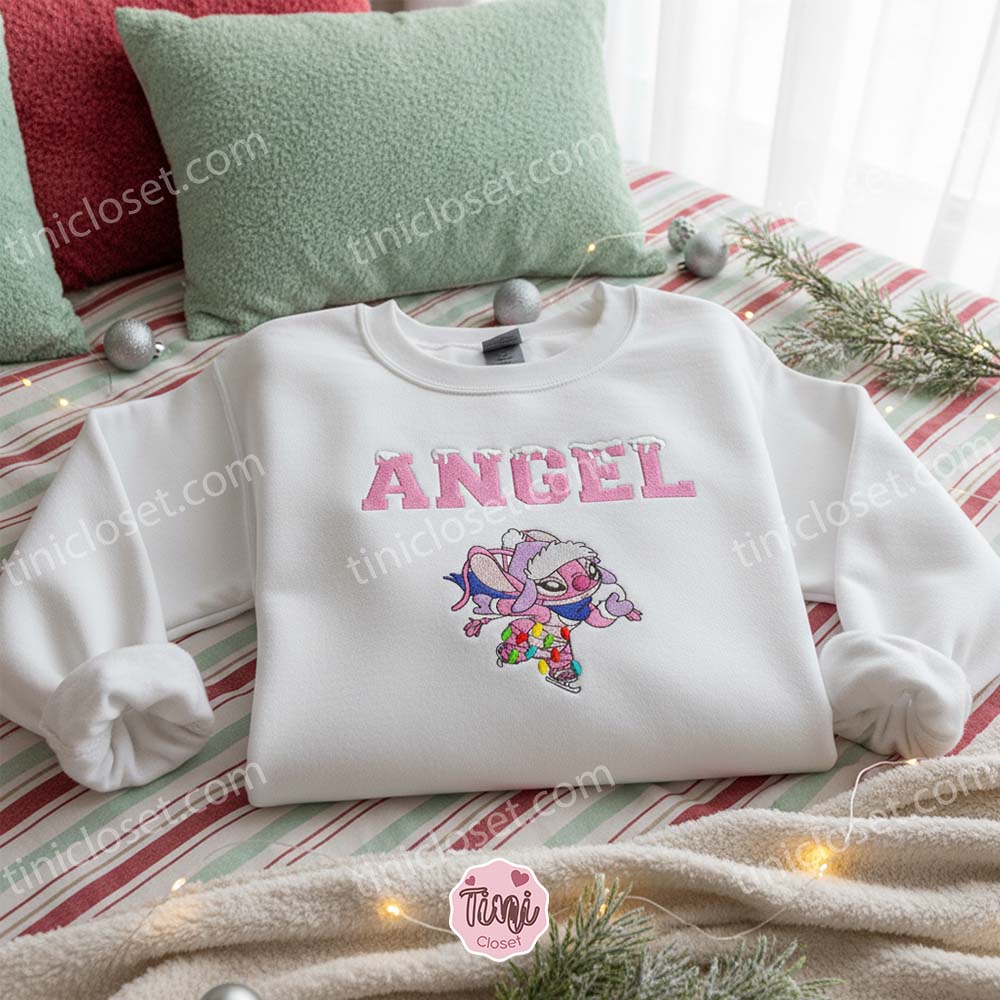Snowy Angel Skating Embroidered Sweatshirt, Pink Angel Christmas Lights Hoodie, Custom Holiday Experiment 624 Crewneck, Gift for Him Her