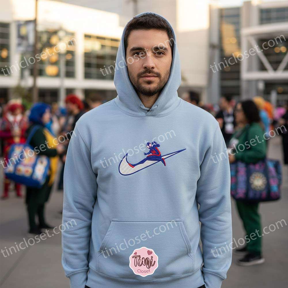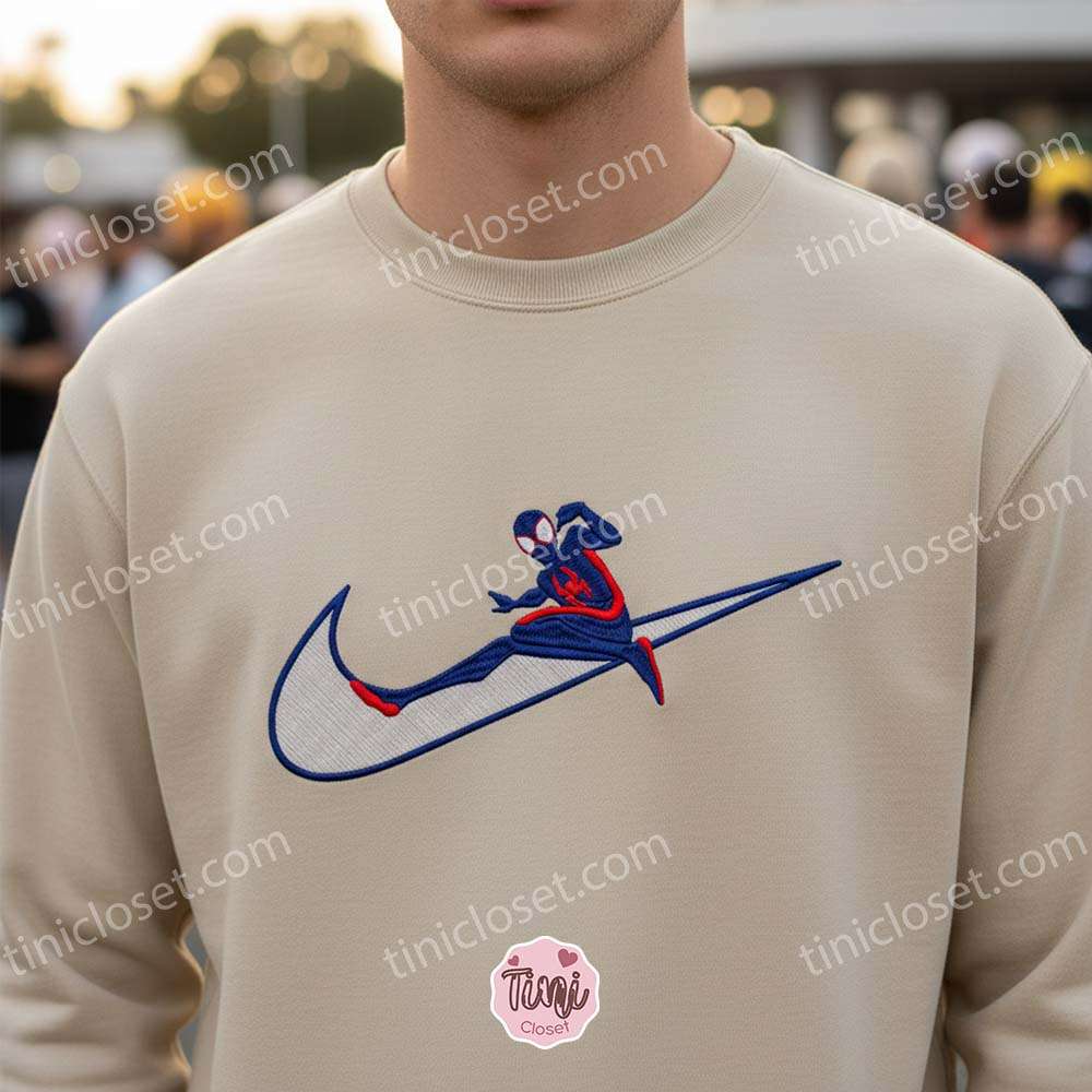 Welcome to Tinicloset, the ultimate destination for premium custom apparel. We are incredibly proud to introduce a design that bridges the gap between cinematic heroism and iconic street style: the Spider-Man Swoosh Embroidered Sweatshirt, Hoodie, and T-Shirt. This exclusive crossover piece captures the dynamic energy of the Spider-Man movies and pairs it with the sleek, undeniable aesthetic of the famous swoosh. It is the perfect apparel for fans who want to elevate their wardrobe with a design that is as timeless as the hero himself.