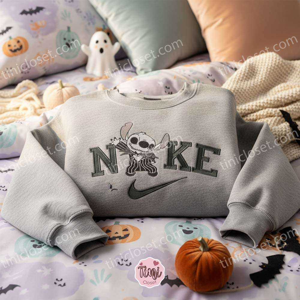 Stitch as Jack Skellington Halloween Embroidered Sweatshirt, Custom Nightmare Stitchmas Hoodie, Spooky Spirit Ohana Crewneck, Gift for Him Her (1)