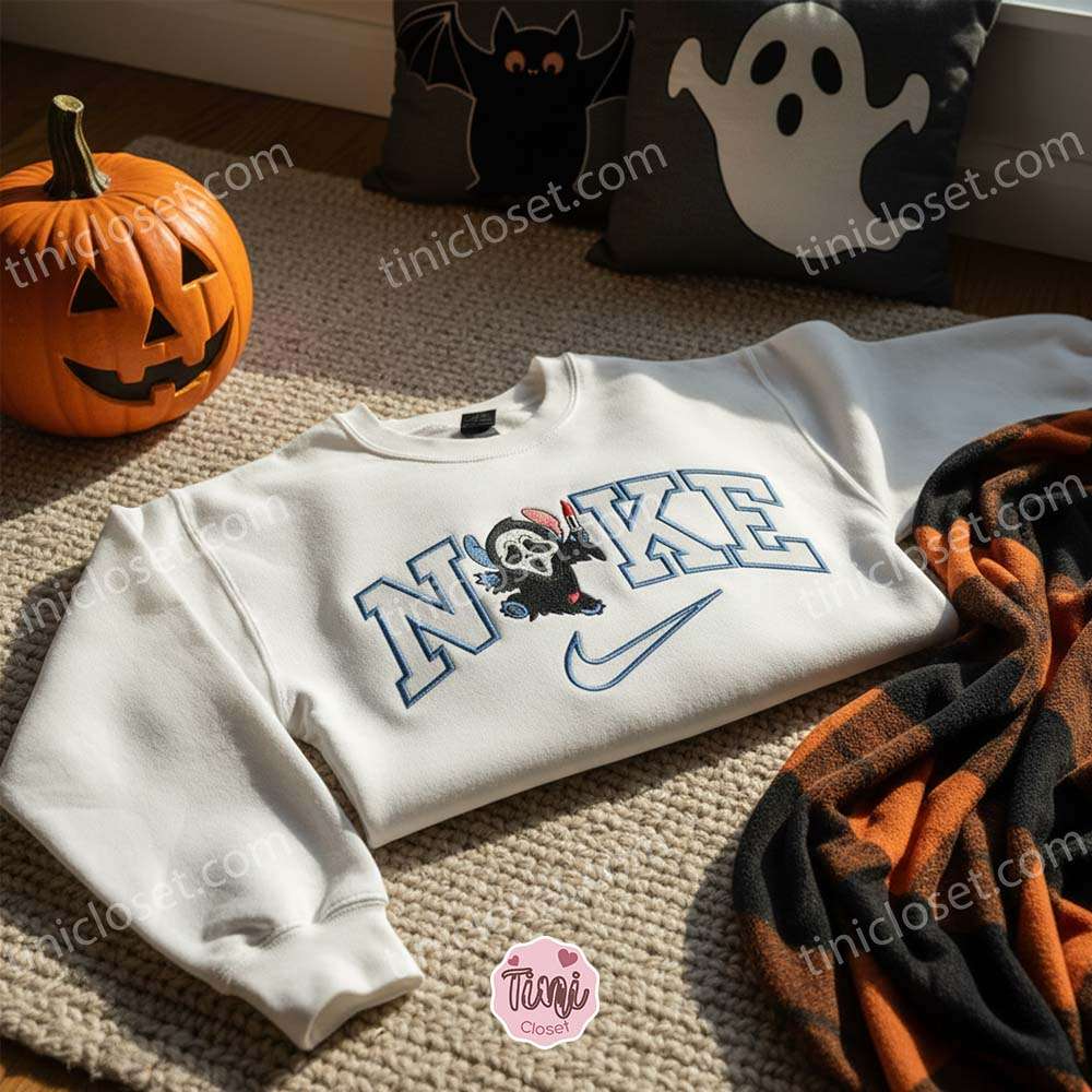 If you are hunting for a Slasher Ohana Experiment 626 Sweatshirt that pays homage to the Woodsboro murders while keeping things adorable, this is your survival gear. We have reimagined Stitch donning the legendary “Father Death” costume—the drooping white mask and the flowing black robe. It is a masterpiece of Spooky Halloween Slasher Apparel that proves Ohana means family, but in a horror movie, family means nobody gets left alive (just kidding… mostly).