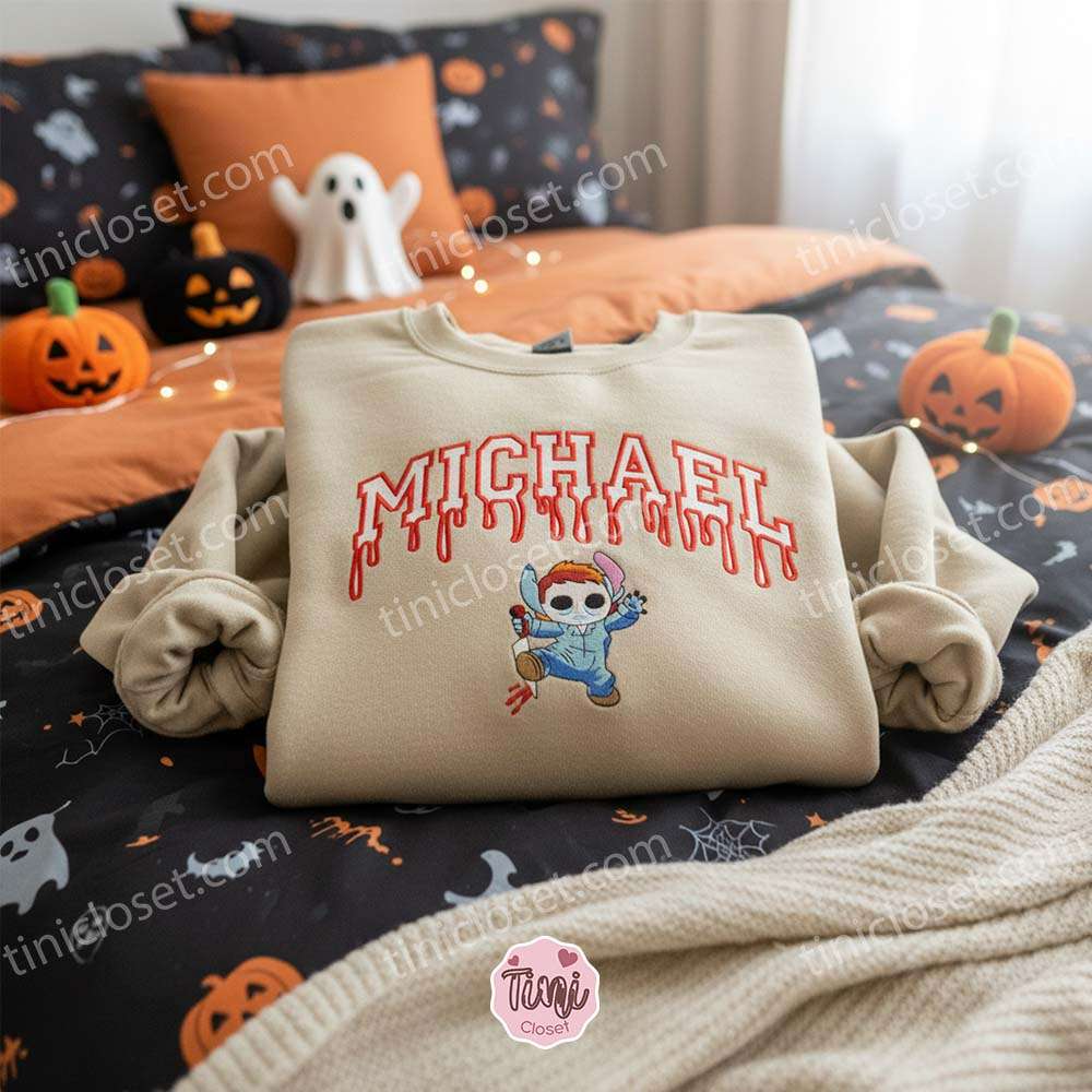 “He Came Home… And He brought Snacks!” – Stitch Cosplay Michael Myers Drip Style Embroidered Hoodie