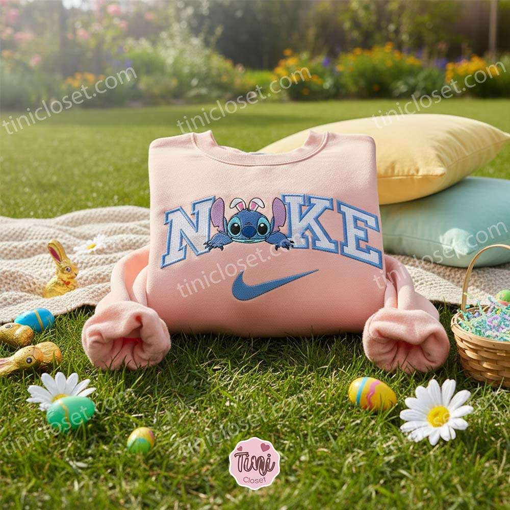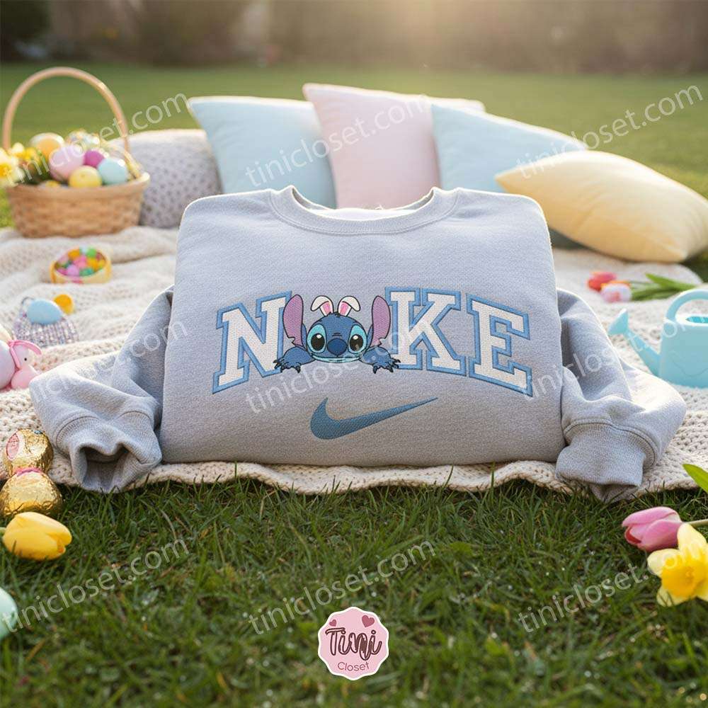Stitch Lying Easter Bunny Ears Embroidered Hoodie, Lazy Bunny Experiment 626 Sweatshirt, Cute Relaxing Spring Apparel, Gift for Him Her