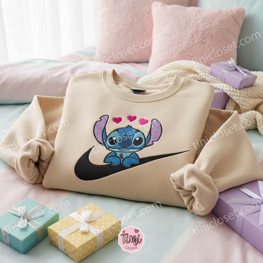 • The Stitch Detail: Perched on the swoosh, hanging from it, or holding the heart is Stitch. He looks adorable, perhaps with hearts in his eyes or blowing a kiss. The juxtaposition of the sporty logo and the cute alien creates a unique “Sporty-Cute” vibe.