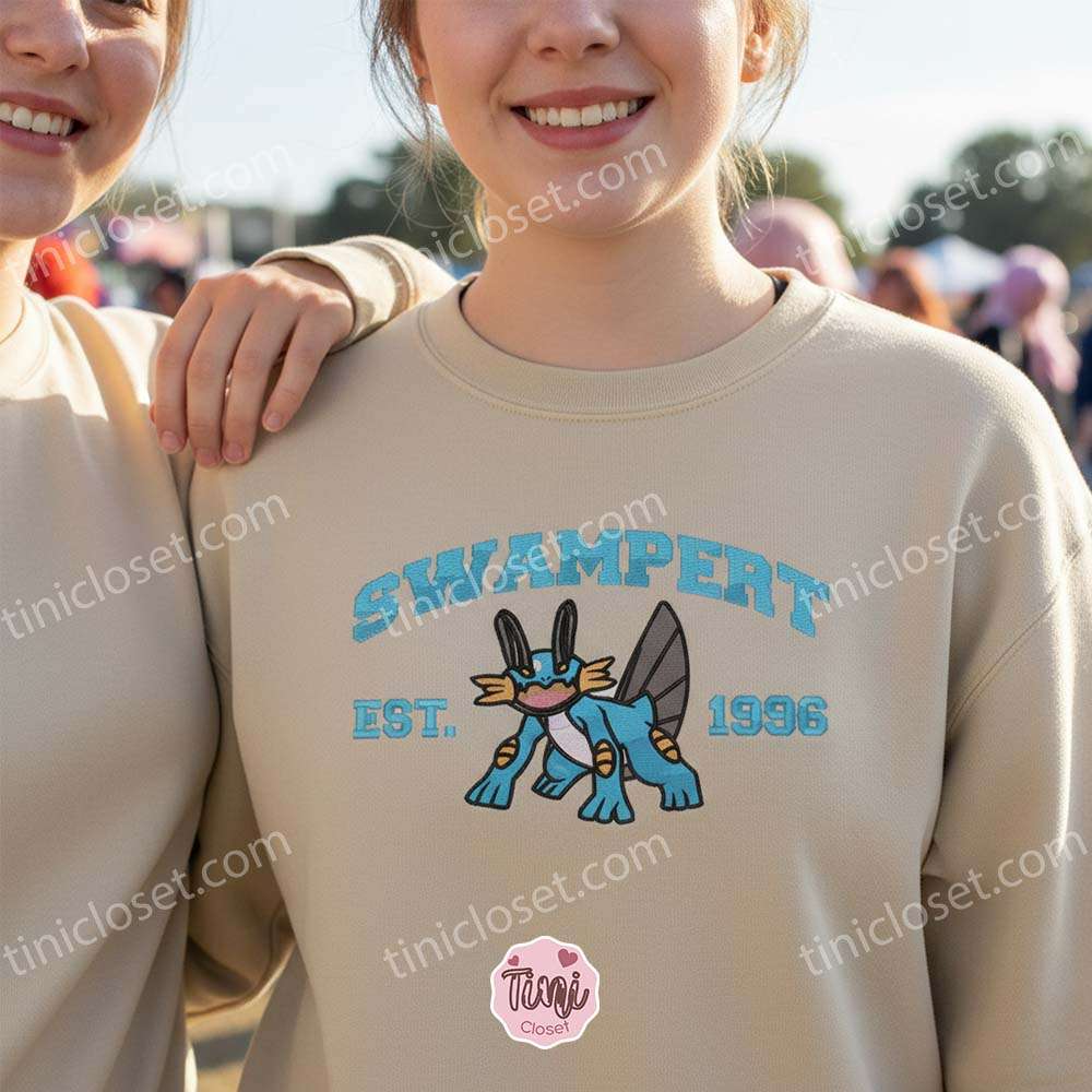 The “Est. 1996” Heritage: Although Swampert arrived in the Hoenn region (Gen 3), the “Est. 1996” text on the chest honors the founding year of the global Pokemon franchise. It gives the sweatshirt a classic “University Alumni” feel, as if you graduated from the Rustboro City Trainer School.
