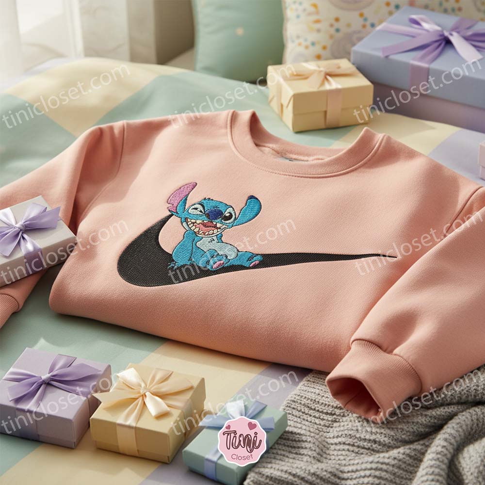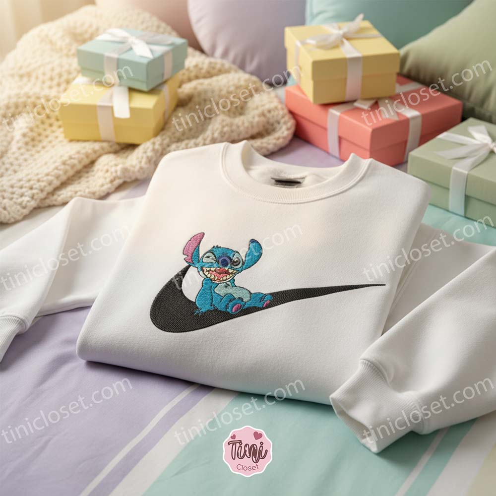 The Color Coordination: We match the thread colors of the Swoosh to complement Stitch’s blue, or we use a contrasting pastel (like pink or lavender) to make the whole design pop against a black or white hoodie.