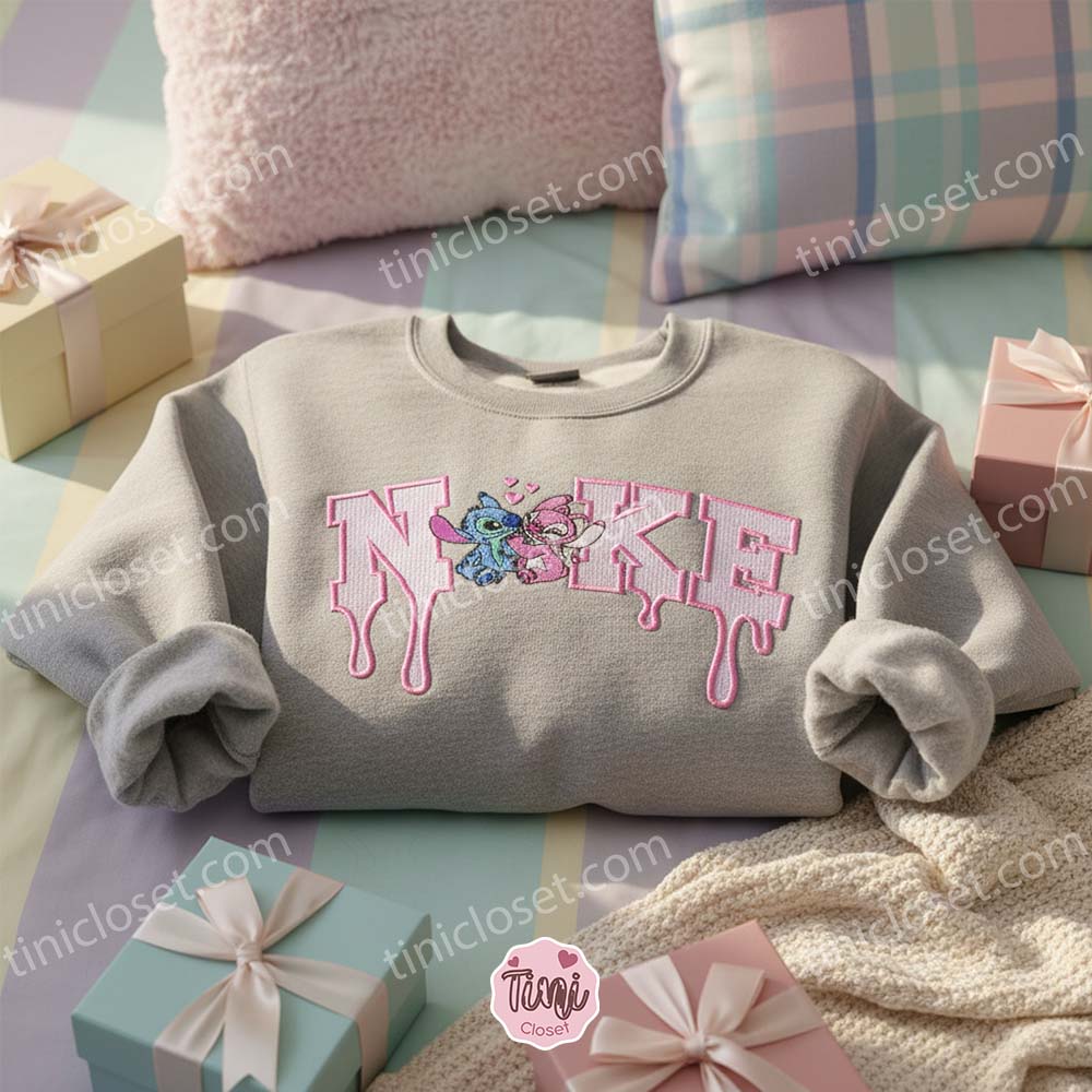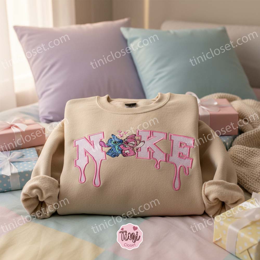 If you and your partner are the type of couple who loves Disney but also keeps up with the latest streetwear trends, this Custom Swoosh Drip Embroidered Sweatshirt set is your perfect match. We have reimagined the iconic swoosh logo with a melting “drip” effect, serving as the perfect perch for Experiment 626 (Stitch) and Experiment 624 (Angel). It is a modern, fashionable take on the classic Valentine Couple Shirt that proves true love is timeless—and trendy.