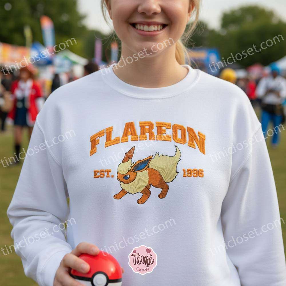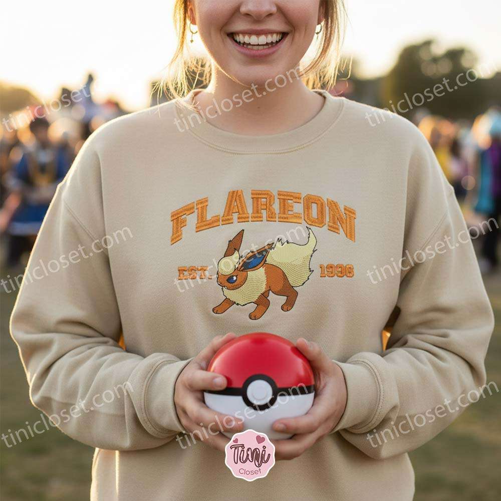 Step into a world where retro collegiate style meets the fiery spirit of Kanto. Our Vintage Flareon Embroidered Sweatshirt is more than just anime merchandise; it is a fashion statement designed for the modern Pokémon trainer who appreciates subtle, high-quality aesthetics. If you grew up trading cards and battling on a Gameboy, or if you simply love the adorable power of the Eeveelutions, this crewneck is the ultimate addition to your wardrobe.